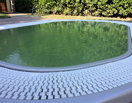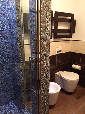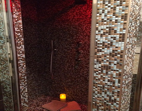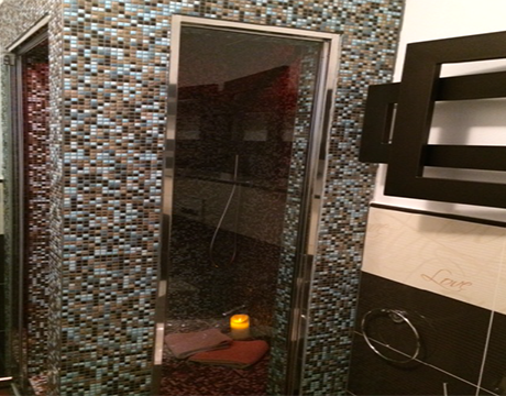interamente rivestito di Bisazza, all'interno del quale è stata incassata la vasca.